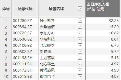 上证报中国证券网讯(记者费天元)Choice数据显示,12月3日,资金净流入额排名前十的个股依次是N中国铀、天孚通信、京东方A、华映科技、TCL科技、新易盛、工业富联、北方稀土、黄河旋风、银河电子。